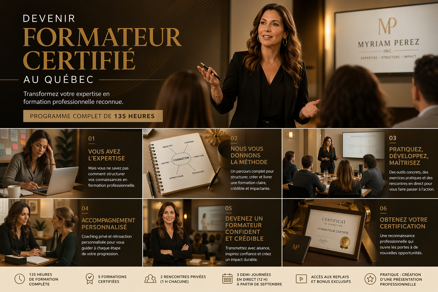 Le programme de formation de formateurs de Myriam Perez Inc. a été conçu pour les professionnels qui veulent transformer leur expertise en formation claire, structurée et prête à être livrée.